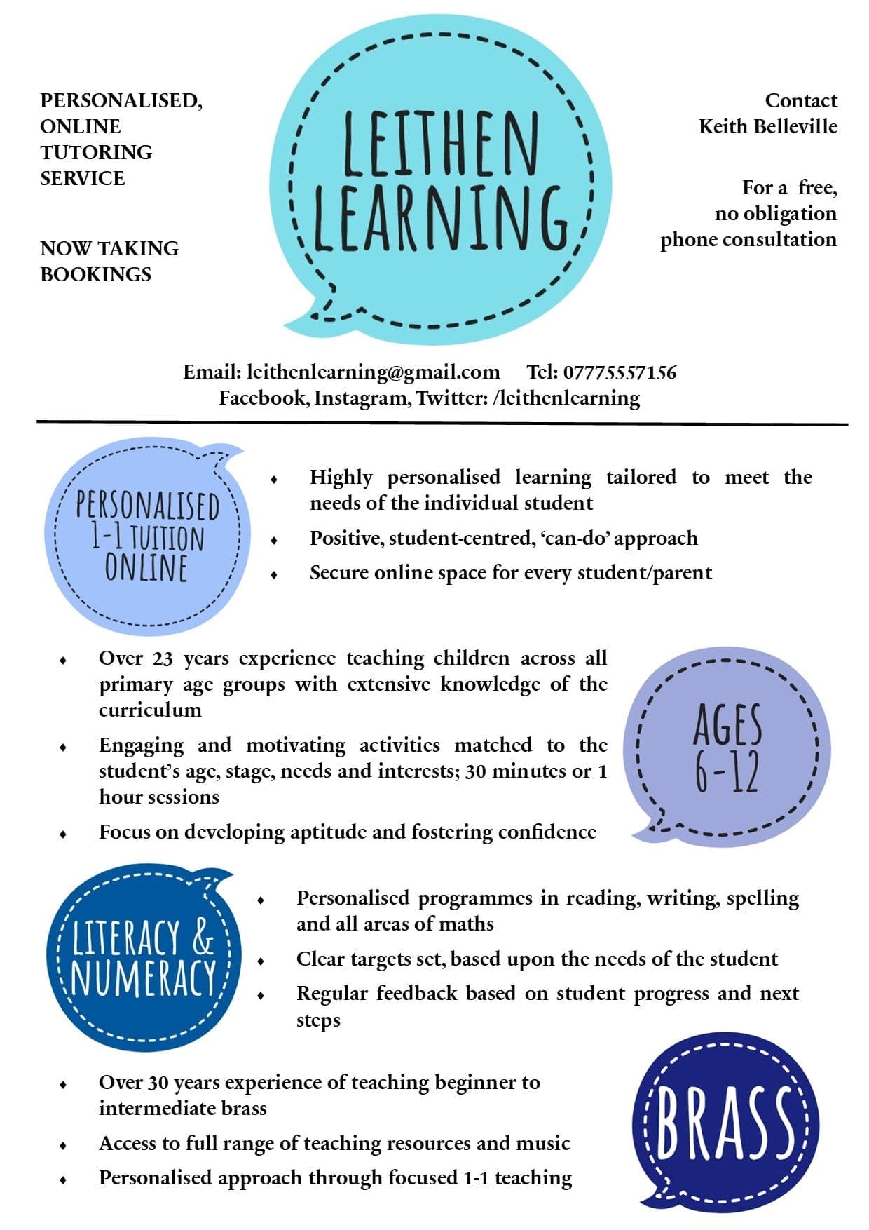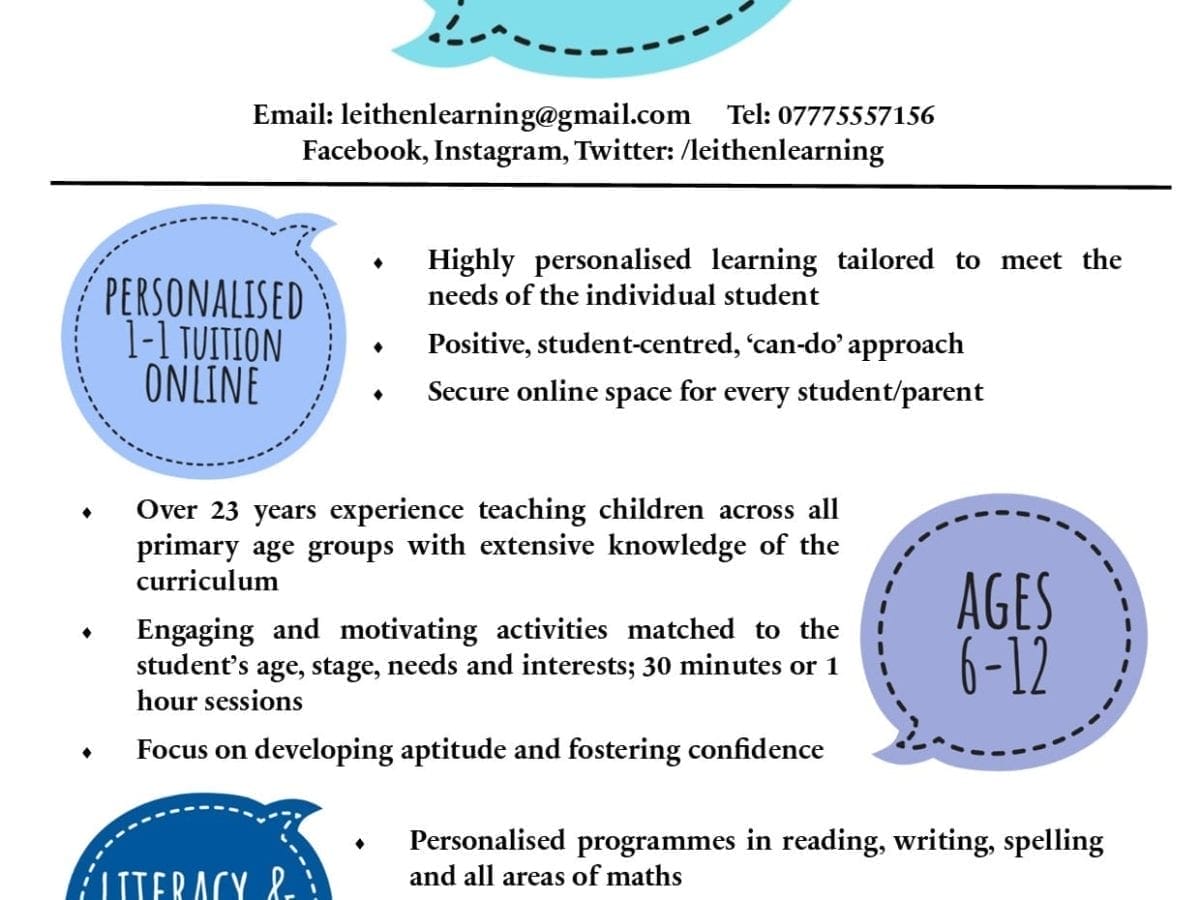 Leithen Learning provides a positive, personalised, online, 1-1 tutoring service in Literacy & Numeracy (ages 6-12); Brass instruments (beginner, intermediate); CV & job application help. Qualified teacher with 25 years experience.